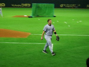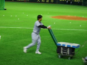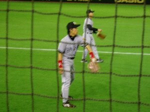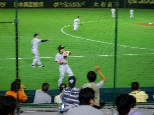 ![]() キャッチボールをする赤星選手と中村豊選手 |