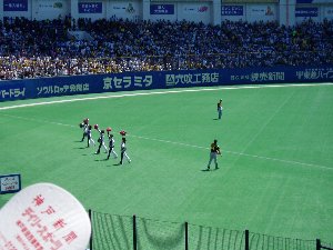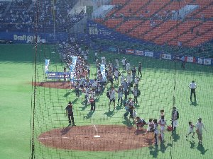 ![]() 花束を受け取りベンチに戻る藤原選手 |