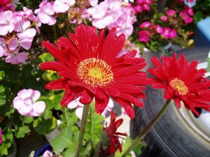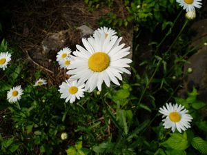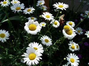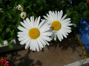 仲良く並ぶマーガレットの花 ★マーガレットには数種類あり一つは一重マーガレット、もう一つは八重マーガレット。花言葉も違い一重マーガレットは「真実の友情」、八重マーガレットは「愛の誠実」 |